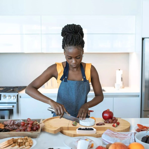 Acest platou nu doar că afișează elegant gustările, dar servește și ca placă de tăiat. Suprafața sa netedă din lemn face ușoară tăierea și servirea tuturor gustărilor preferate într-un singur loc.