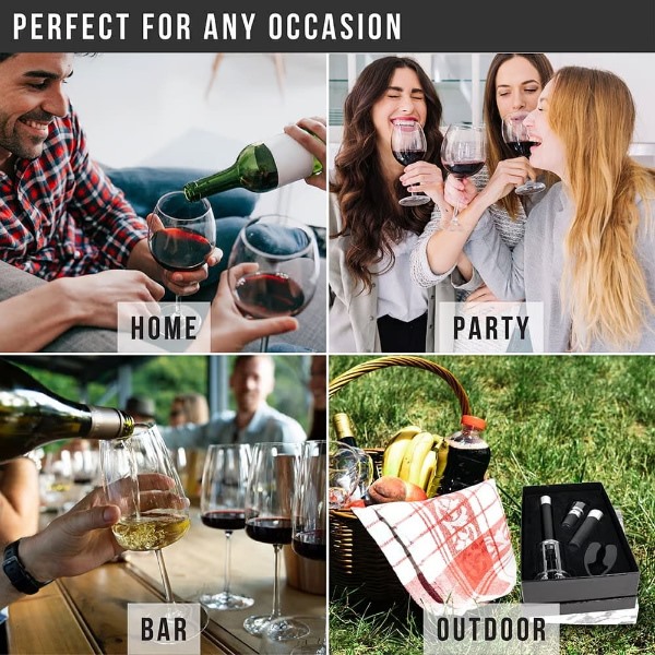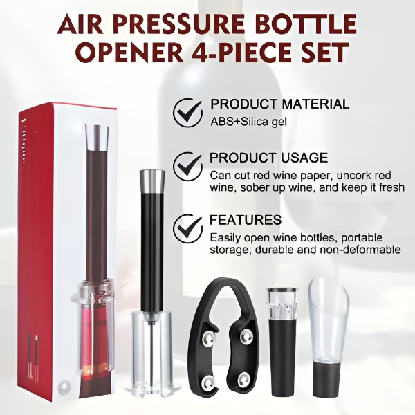 Acest set 4-în-1 include un deschizător cu pompă de aer, un tăietor de folie, un aerator pentru turnare și un dop de vid pentru o experiență perfectă a vinului.